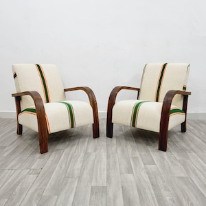 Mid-Century Modern Walnut Armchairs: Wool Rug Upholstery, Set of 2