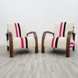 The sturdy walnut frame brings warmth and durability, while the repurposed wool rug adds a unique pattern and cozy feel to every chair—no two are exactly alike. Perfect as a statement piece for your living room, reading nook, or bedroom.