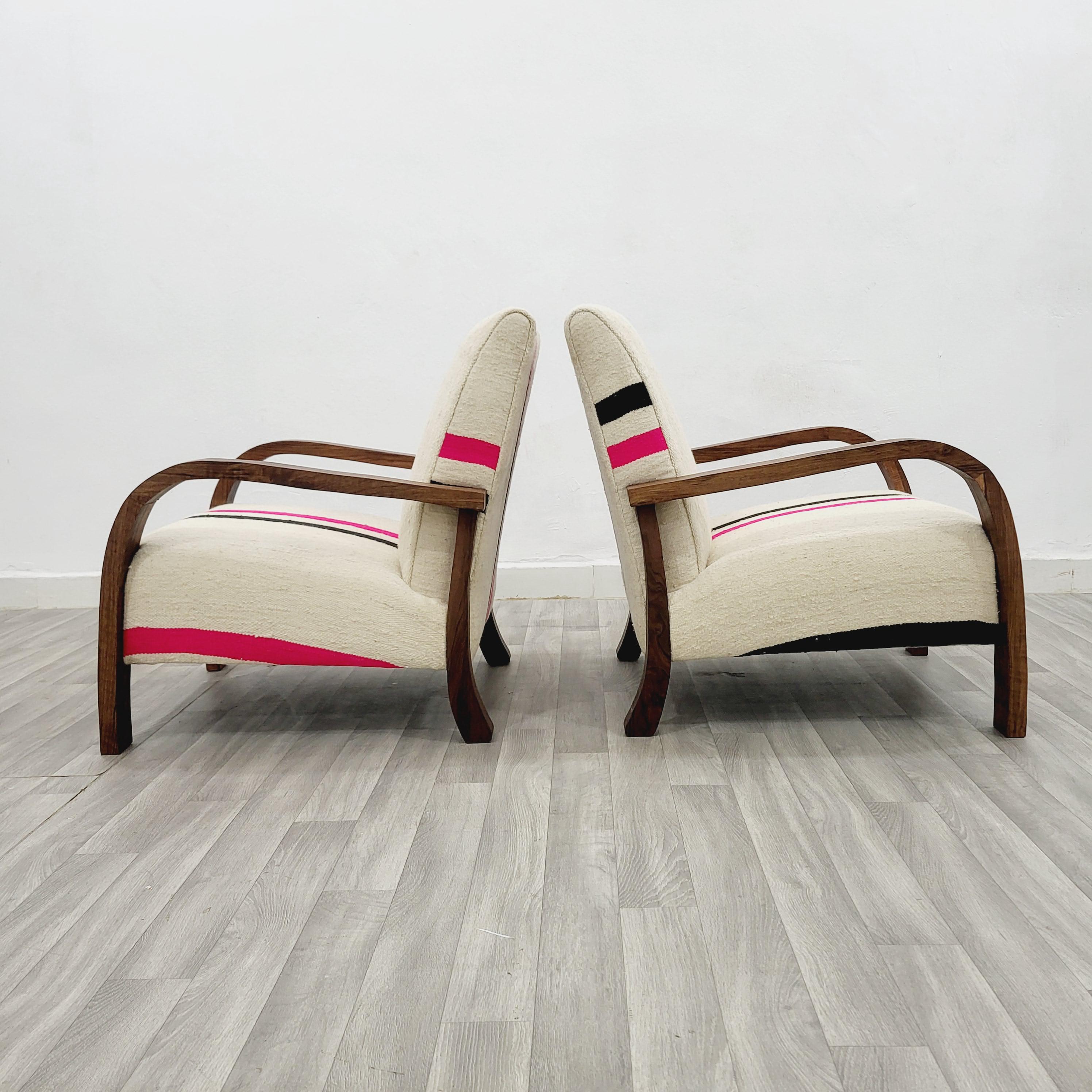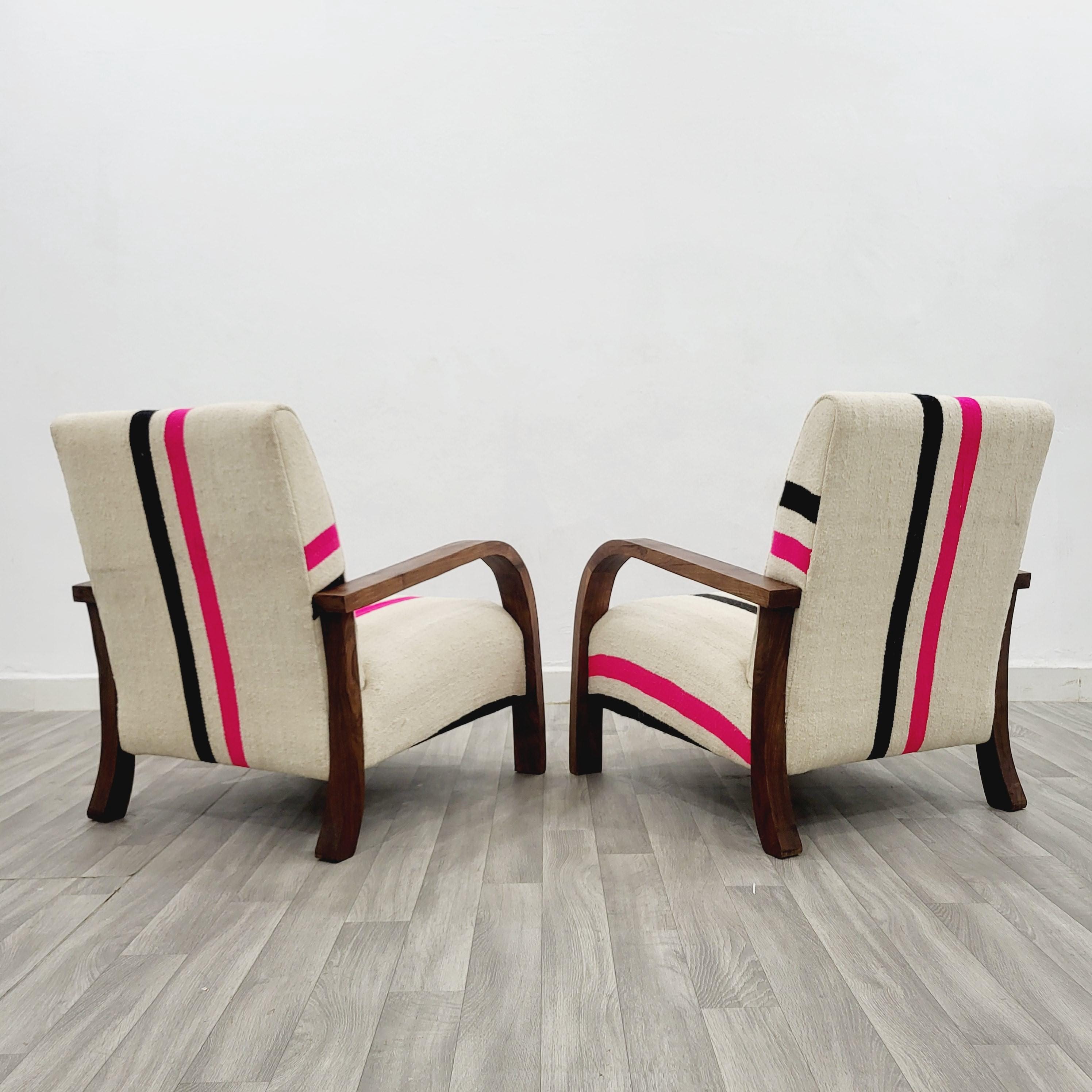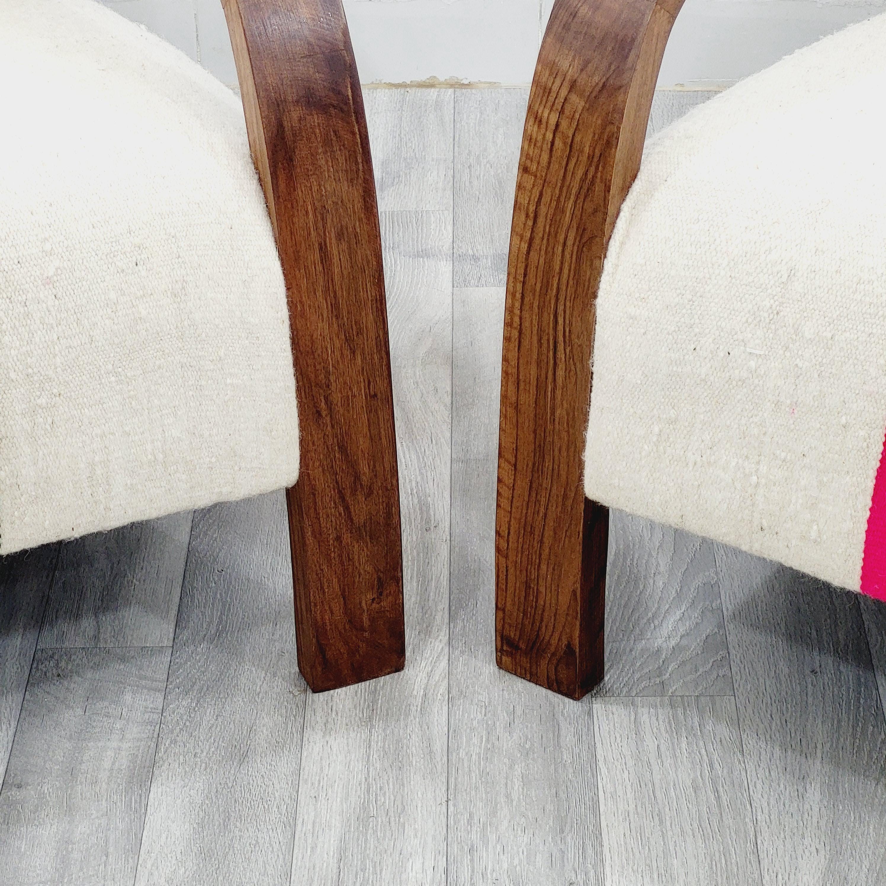 Set of 2 Handmade Walnut Armchairs: Vintage Kilim Wool Rug