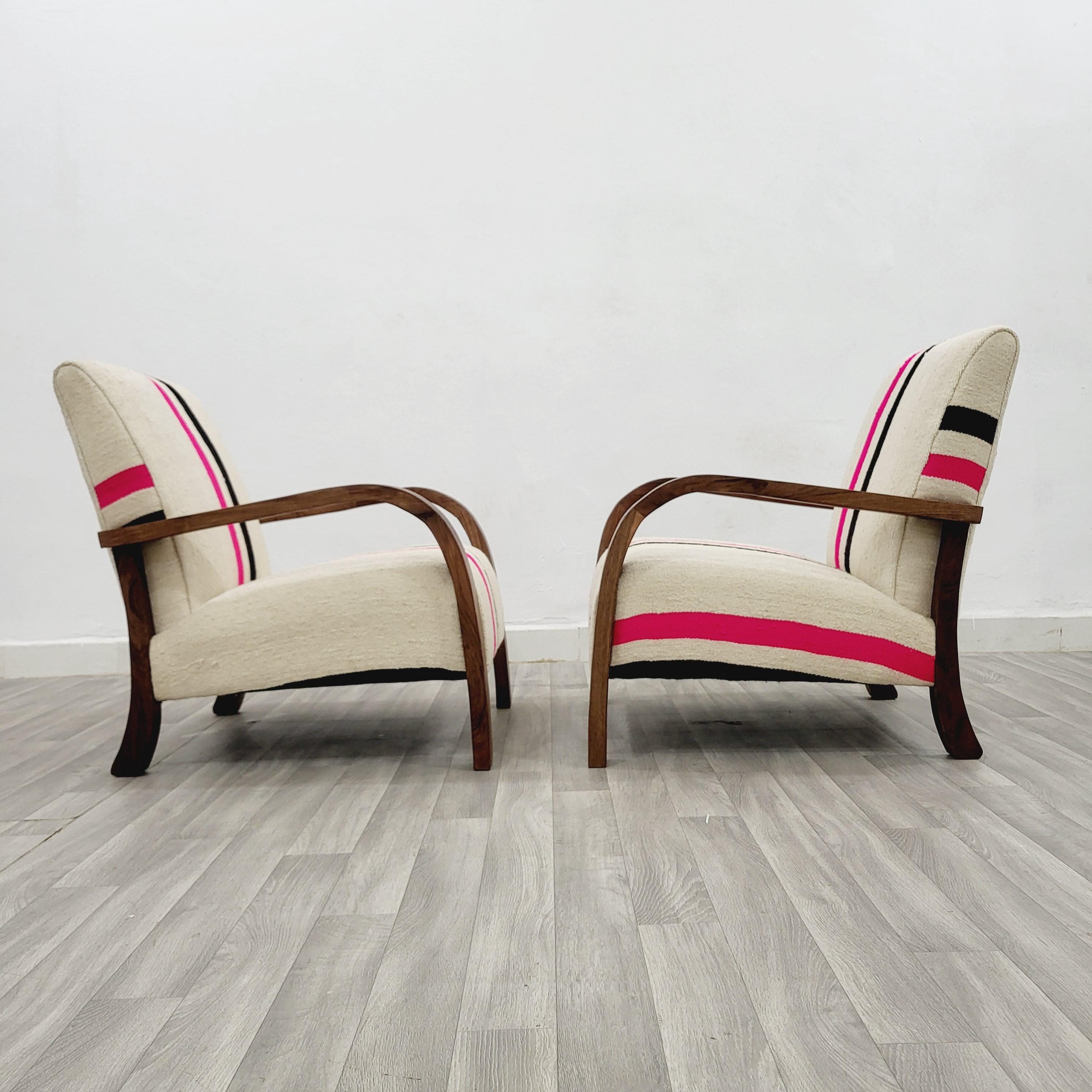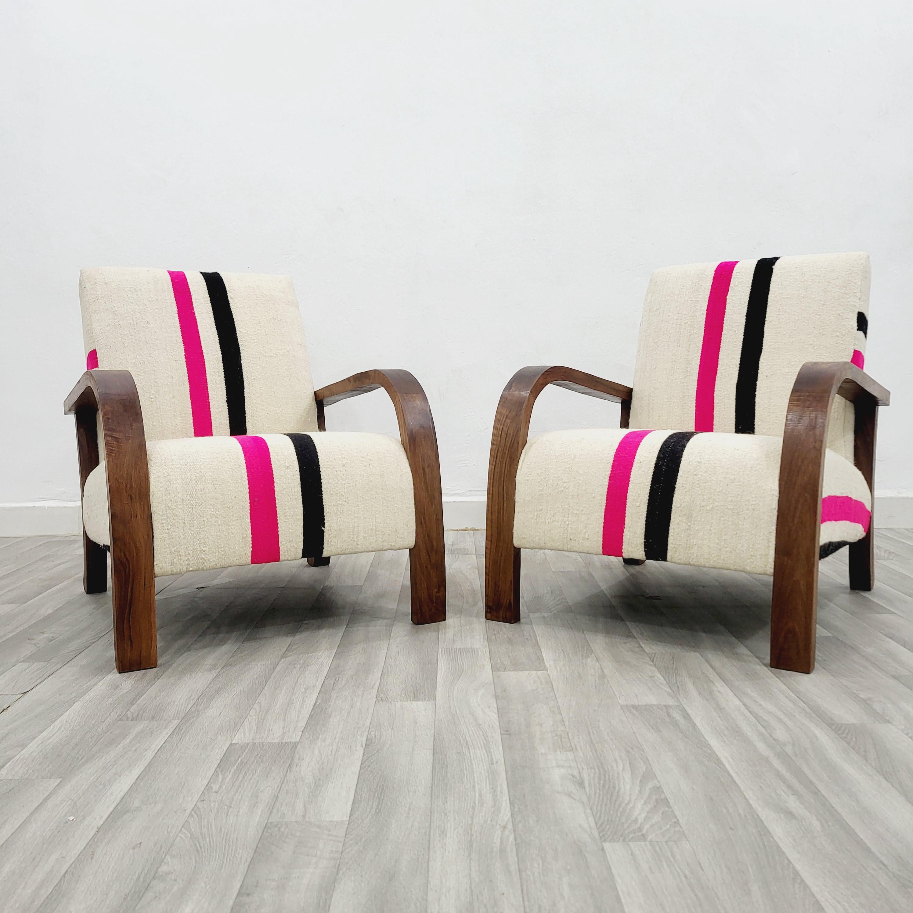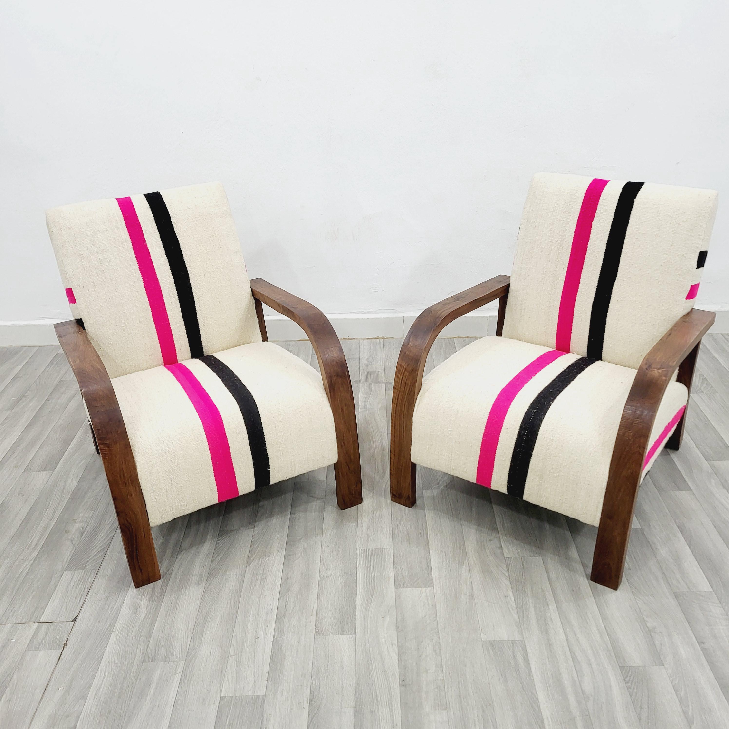 Set of 2 Handmade Walnut Armchairs: Vintage Kilim Wool Rug
